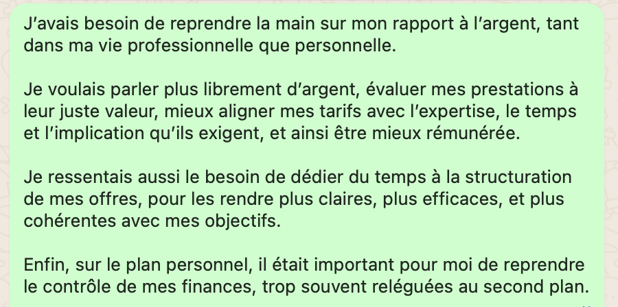 - Apprendre à valoriser ton travail (même si tu doutes encore de ta légitimité), pour recevoir plus sans culpabilité