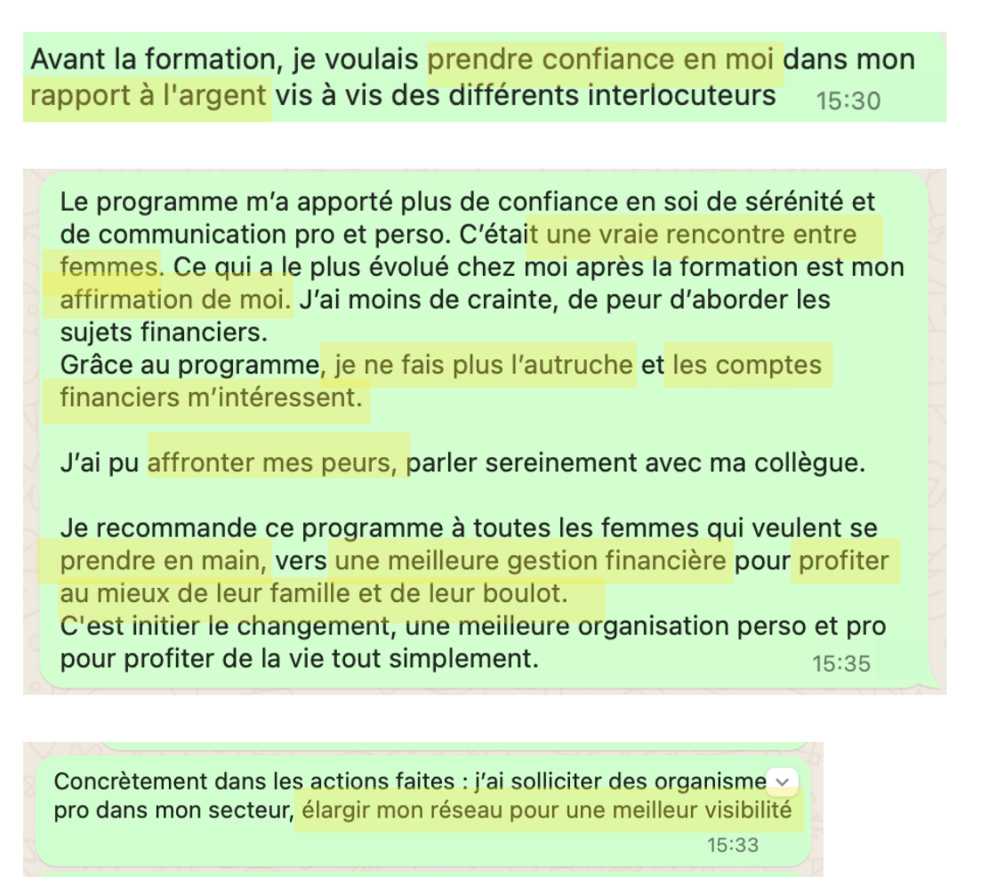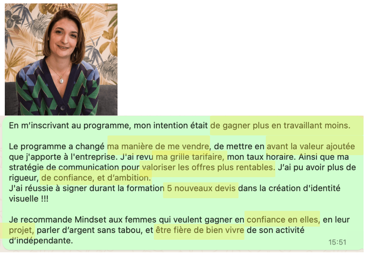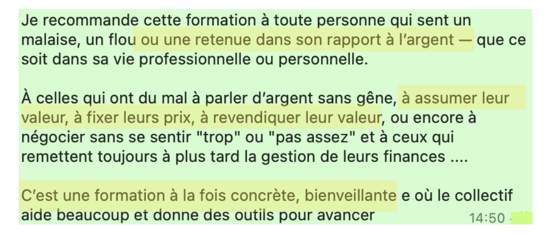 “Je recommande Mindset Abondance pour toutes les personnes qui veulent gagner en confiance en soi, qui souhaient démystifier son rapport à l'argent et savoir parler d'argent aux différents interlocuteurs aussi bien pro que perso”