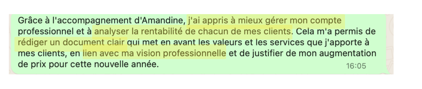 Un accès whatsapp privé avec moi pour toute question de négociation/argent urgente pendant toute la durée du programme : coaching flash, relecture devis, ou la capacité de me poser une question directement sur toute la durée du programme